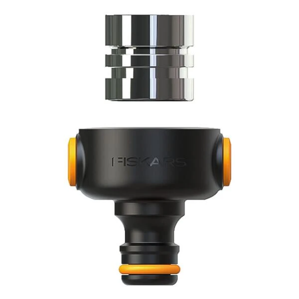 Sluit je tuinslang eenvoudig aan op de binnenkraan met deze kraankoppeling van Fiskars. De kraankoppeling omvat twee metalen draadadapters, een M22 vrouwelijke en een M24 mannelijke adapter.