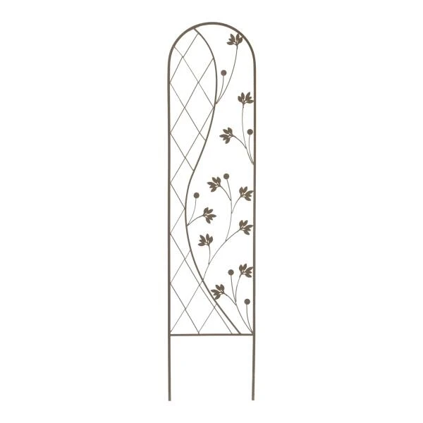 Klimplantensteun uit metaal afgewerkt met een plantenmotief. Helpt planten te ondersteunen maar kan ook louter decoratief gebruikt worden in de tuin.